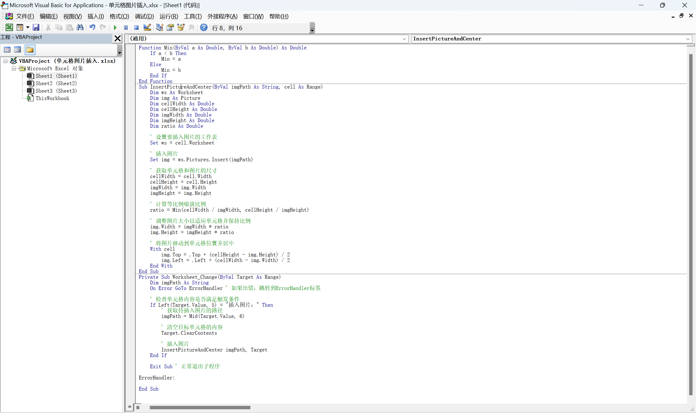 End Sub设置复制VBA脚本到Excel文件中,如下图所示,打开脚本编辑器,将VBA代码复制到需要插入图片的Sheet页中,按 Ctrl+s 保存脚本。