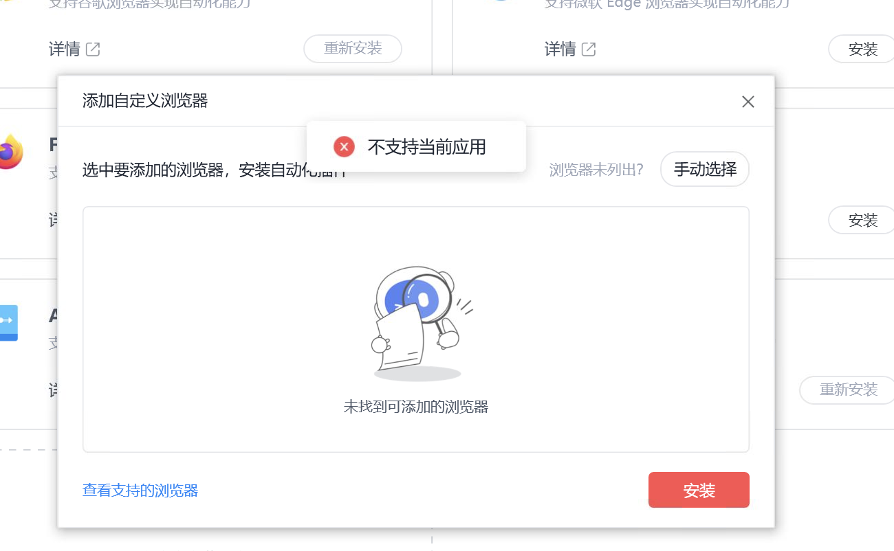 影刀自定义添加浏览器,无法添加比特浏览器,最开始可以识别出浏览器,但是安装插件后无法使用,把添加的比特浏览器删除后,再重新添加,则提示:不支持当前应用。
