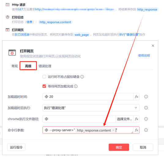3、拿到IP后,怎么让浏览器使用这个IP呢?影刀的“打开网页”指令,高级设置填写命令行参数:--proxy-server="这里填写获取到的IP",这样在执行打开网页时,浏览器就会使用这个IP代理了(前提是浏览器必须先完全关闭)。