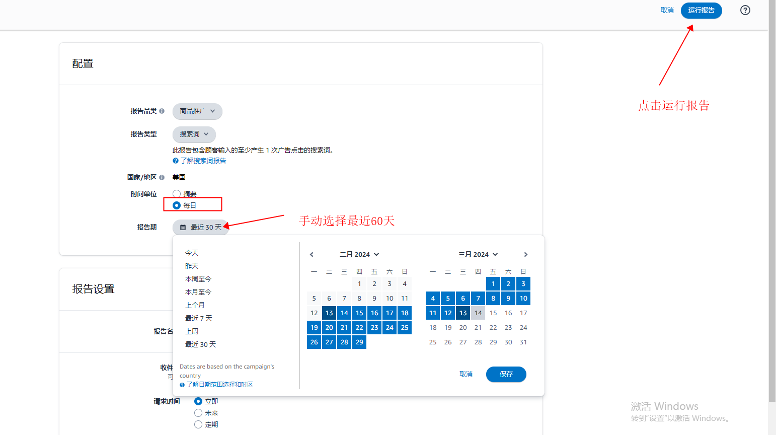 广告->广告活动管理->衡量和报告->搜索广告报告->创建报告->选择时间运行报告->回到创建报告页面下载