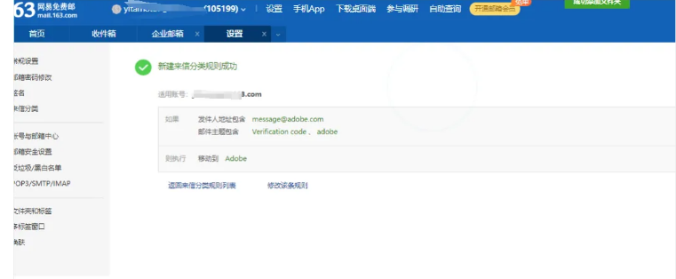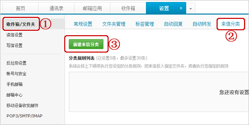 2、点击设置首页左侧导航栏中的“收件箱/文件夹”-->选择“来信分类”子选项-->最后点击“新建分类规则”;