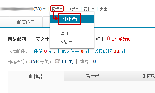 1、登录163免费邮箱;点击页面上方的“设置”-->“邮箱设置”;