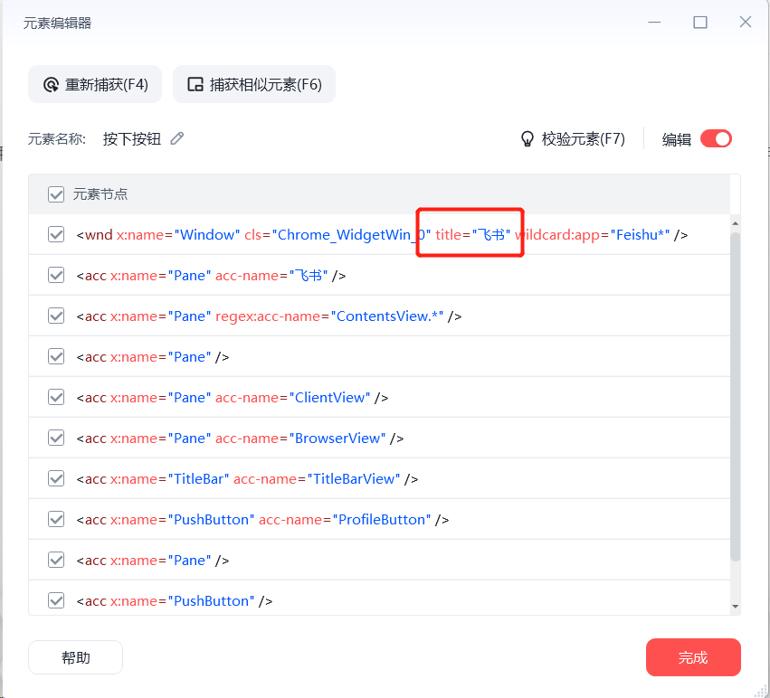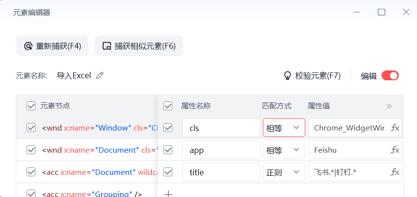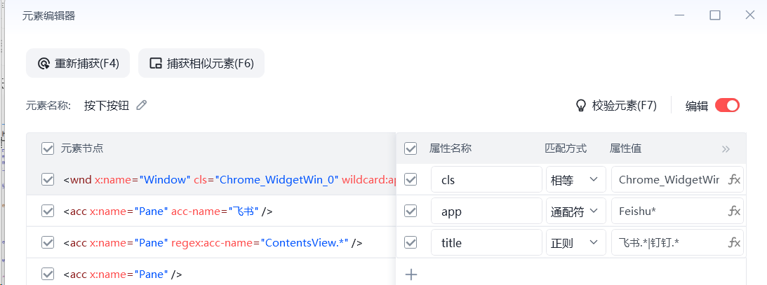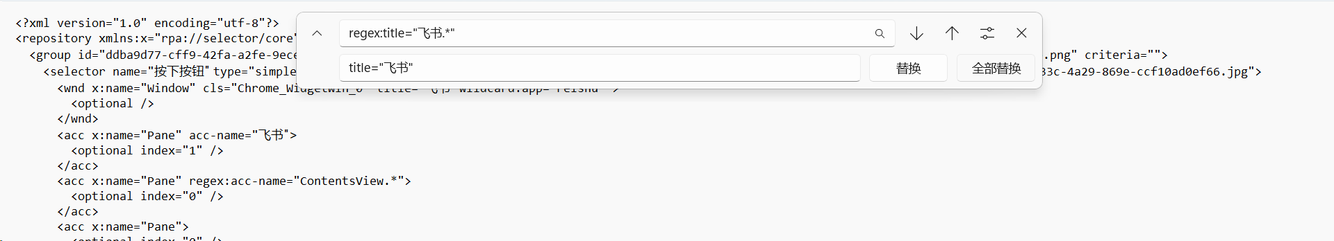 xml.write(file_name)比如用这个办法,将咱们原来所有的相等匹配方式title='飞书',可以改成以正则匹配的方式匹配'飞书|钉钉'