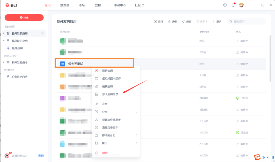 那么首先就是咱们的工程文件到底在哪,每一个项目都有对应的元素库文件,首先挑选一个幸运鹅流程,选择修改应用信息。打开文件所在位置
