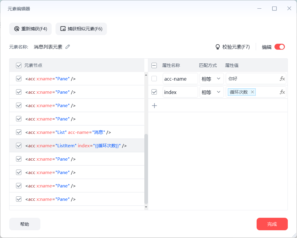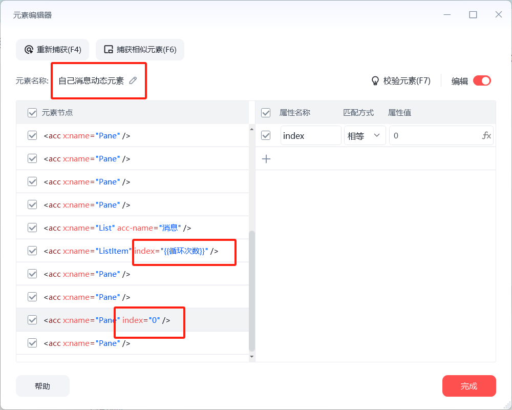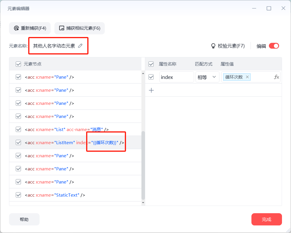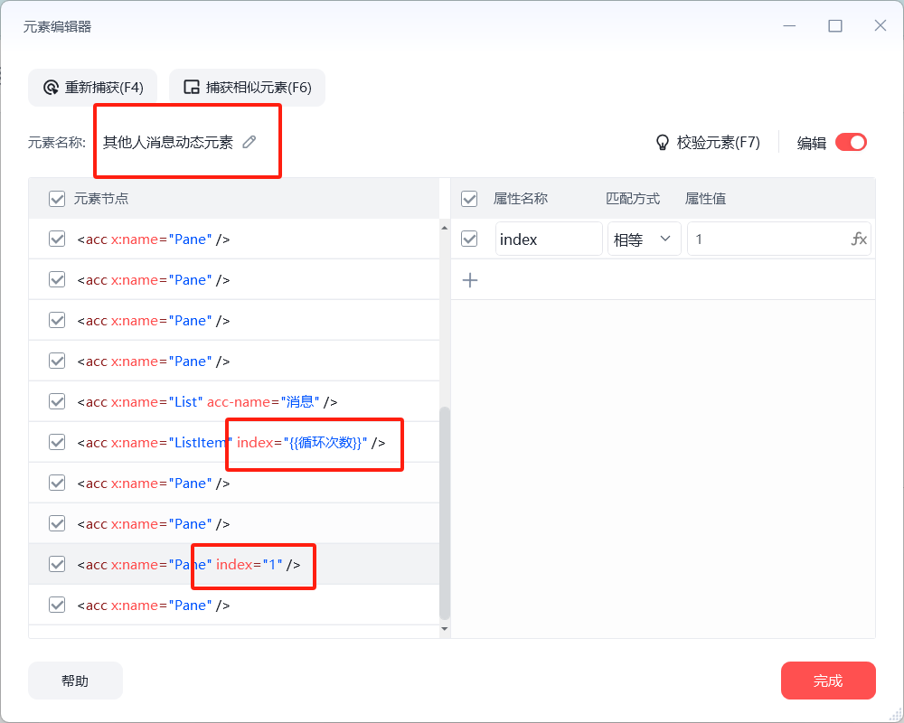 不难发现,左下图Lisltem层级的index代表第n条信息,因此只需for次数循环,通过改变全局变量,循环获得每条信息元素