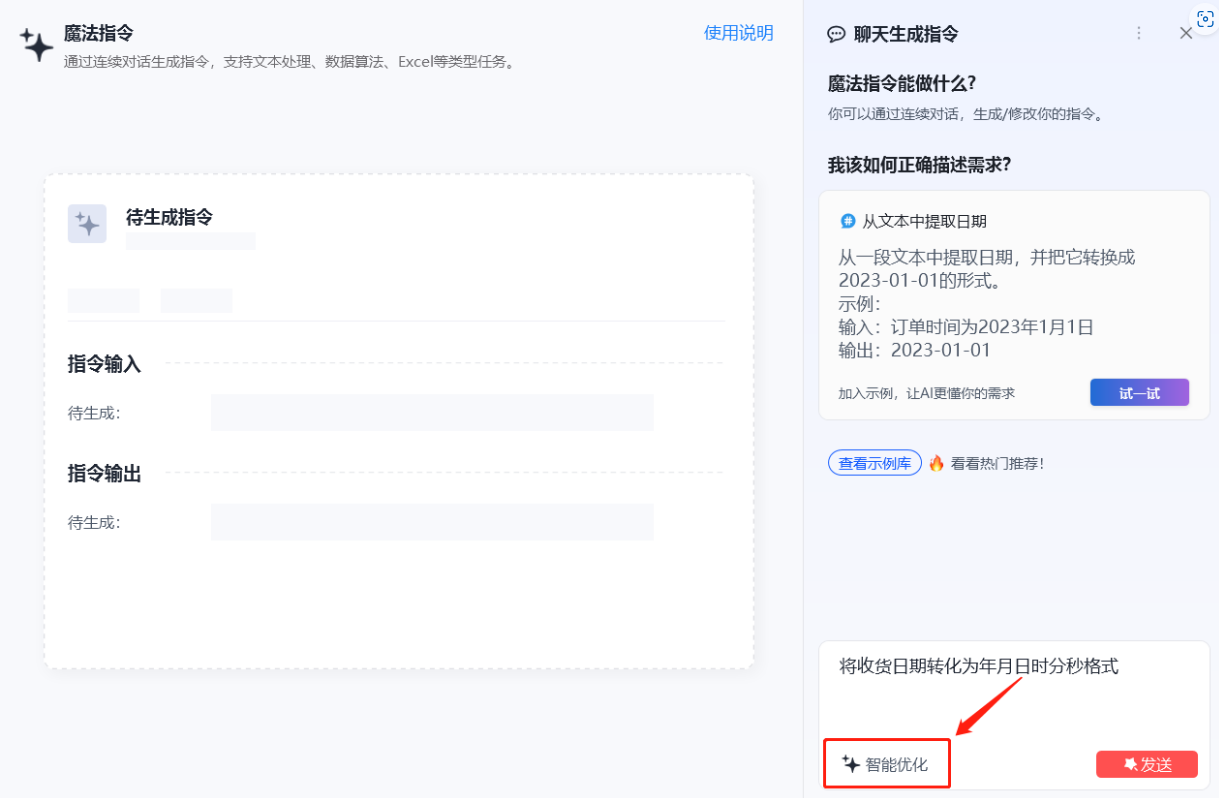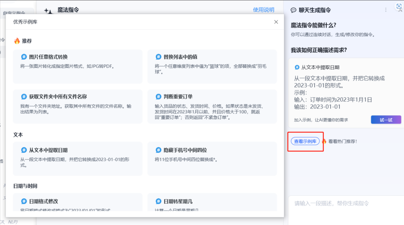 包括文本、日期、Excel、列表、图片等常见魔法指令使用场景。示例库中,遵循的提问模板如下: