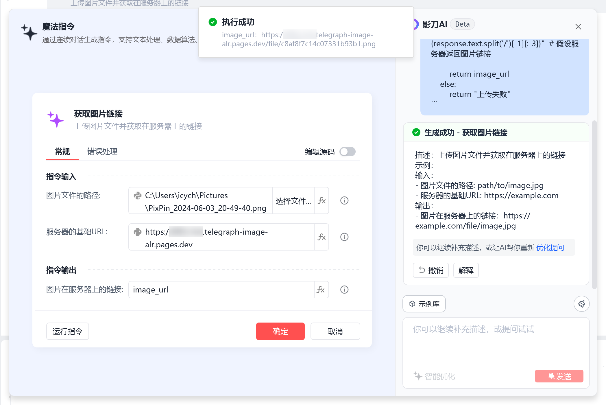 当然,最好能够提供api接口,直接发送个post请求,然后直接返回图片地址,这样就在影刀里欢快调用指令上传图片啦!看了下文档,修改了下代码,就可以直接调用 api 啦!
