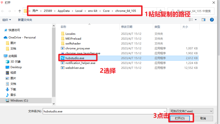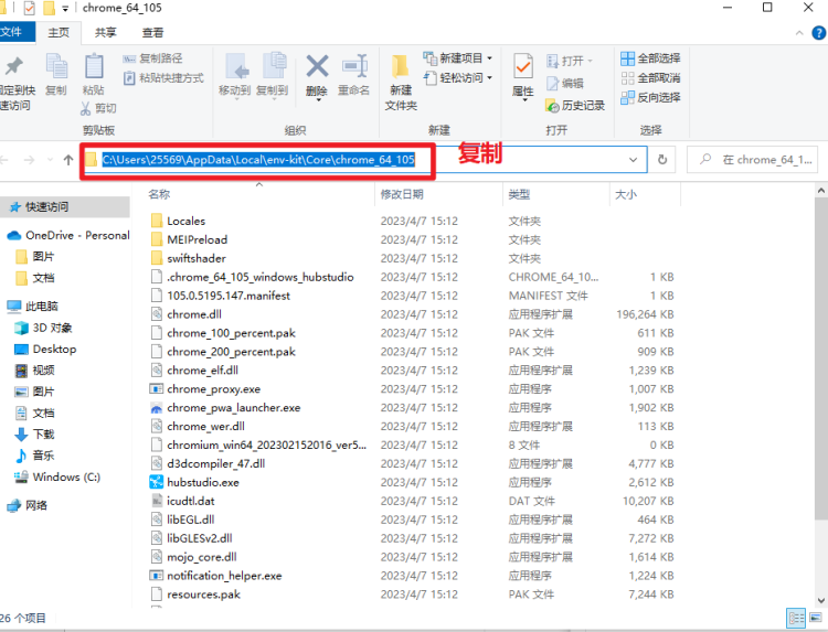 win+r输入%localappdata%\env-kit\Core,hubstudio浏览器版本不同,文件夹名称不同,点击chrome_64_xxx进入到文件夹中,复制文件夹路径