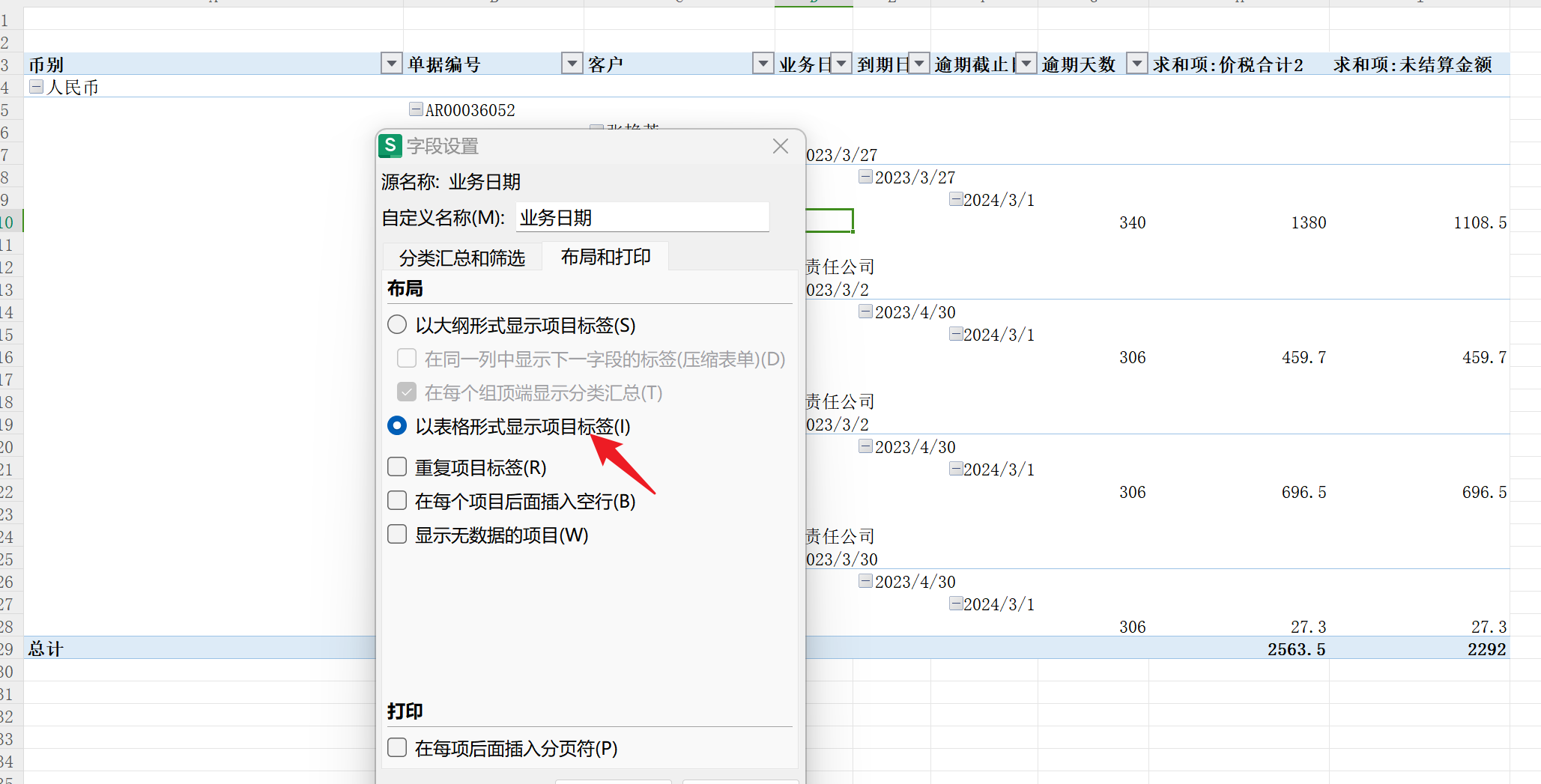 这边想把数据透视表的每个字段设置成以表格形式显示,不知道该用什么指令去实现,图一是透视表刚生成时的样子,图二是想要实现的效果。请大佬们出出主意