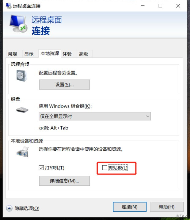 使用Windows远程桌面连接时会默认设置共享剪切板,导致虚拟机在运行应用时主机无法正常使用剪切板