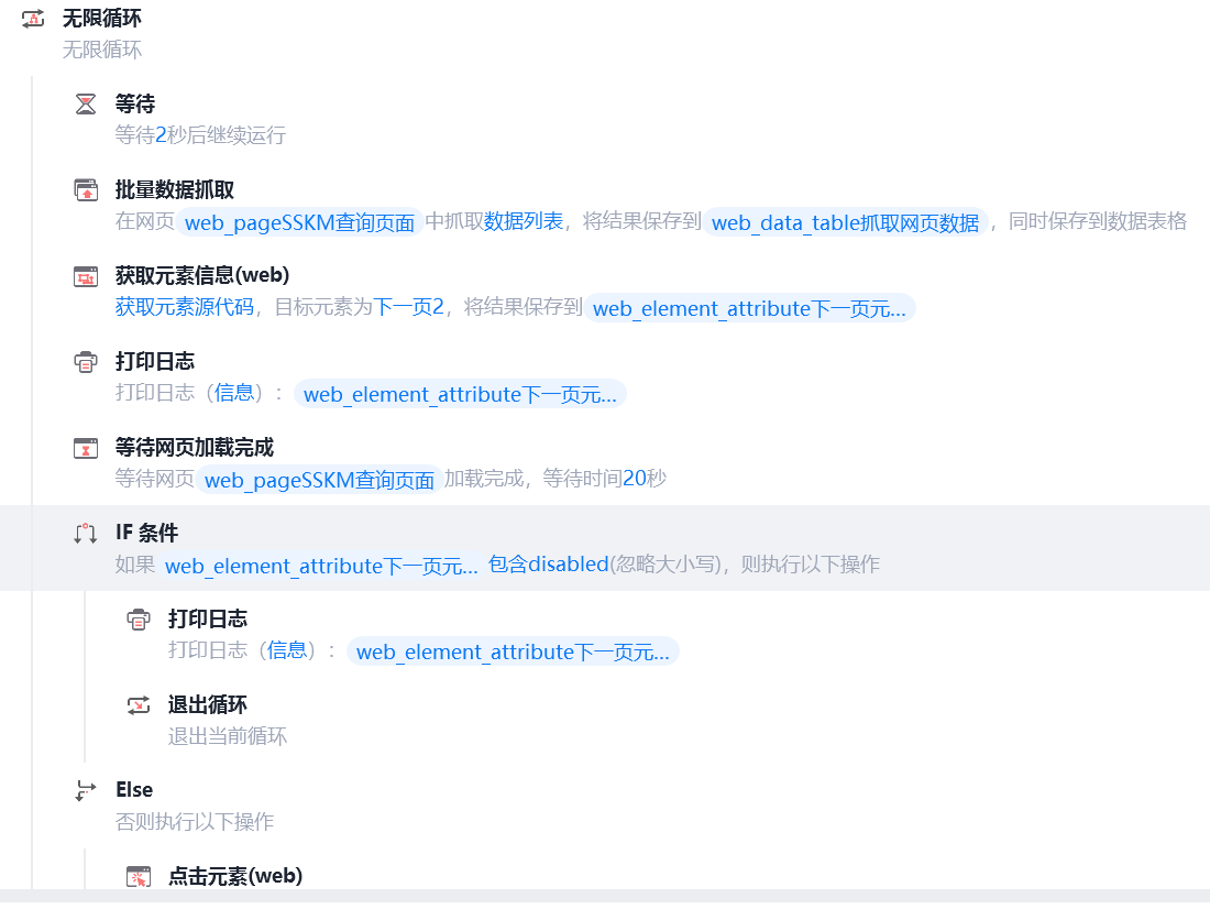 您好 获取元素信息这里,选择文本内容,元素属性都不对,所以选择了元素源代码(若没有更多下一页是会有disabled的源代码内容),但是再IF判断时判断不出来,直接就停止退出循环,请帮忙看看是哪里设置不对