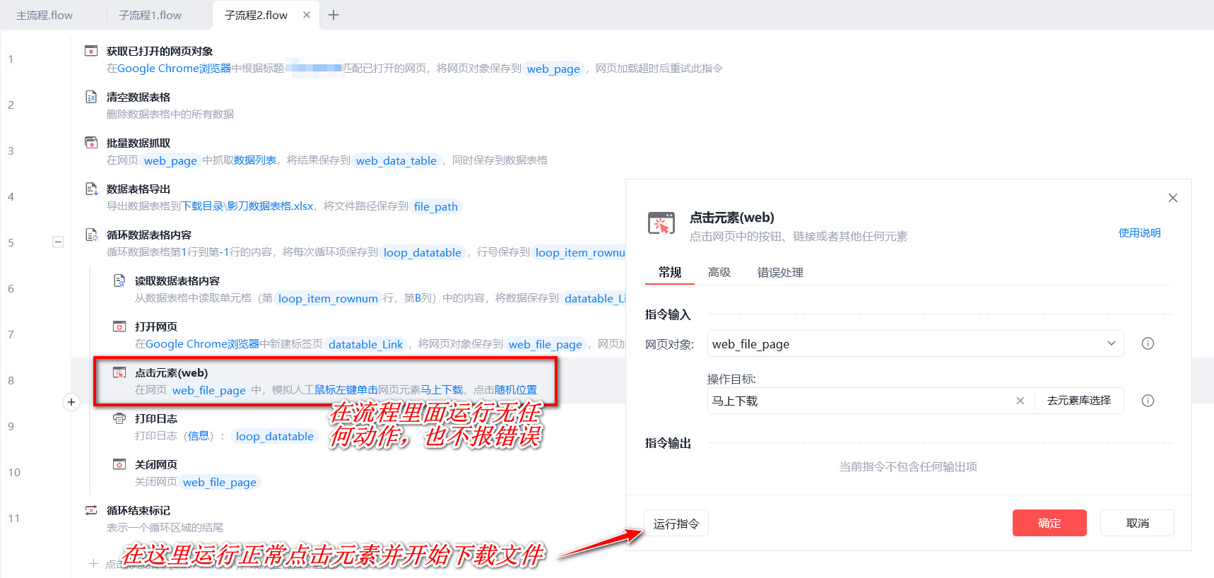 在“点击元素”对话框里面单独运行这条指令,可以正常点击指定的元素(下载按钮)并下载文件,但是在流程里面运行到这一条指令的时候无任何反应,不报错,也没点击下载文件,调试一步步到这步也看不出问题。