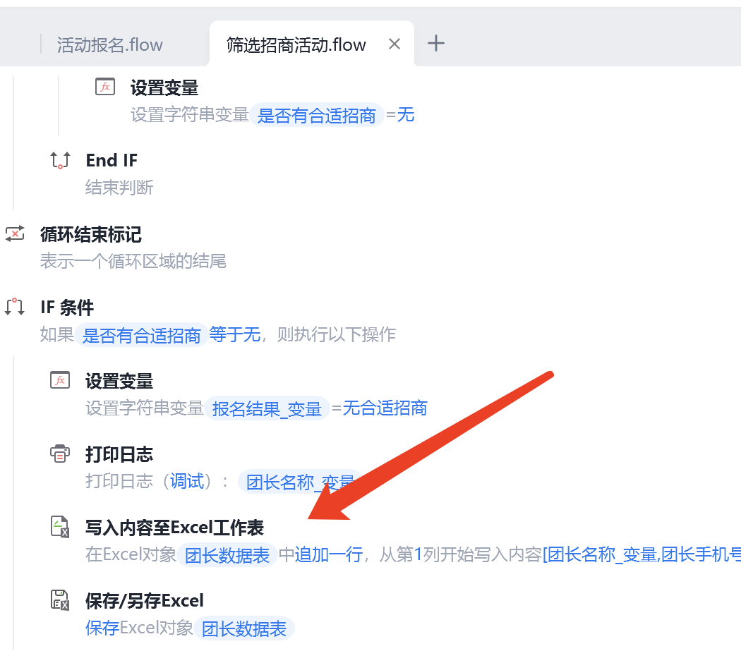 其中筛选招商活动的子流程中,有表格写入的指令