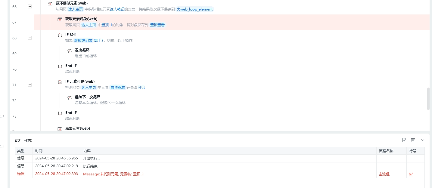 想获得小红书博主笔记近3篇的数据,目前可以实现,但是如果博主主页有置顶的话,就不能识别跳过。循环相似元素,也获取了置顶的元素对象,关联了父元素,在校验元素的时候可以,但是运行的时候报错,元素找不到。请大佬帮我看一下,到底哪里出了问题