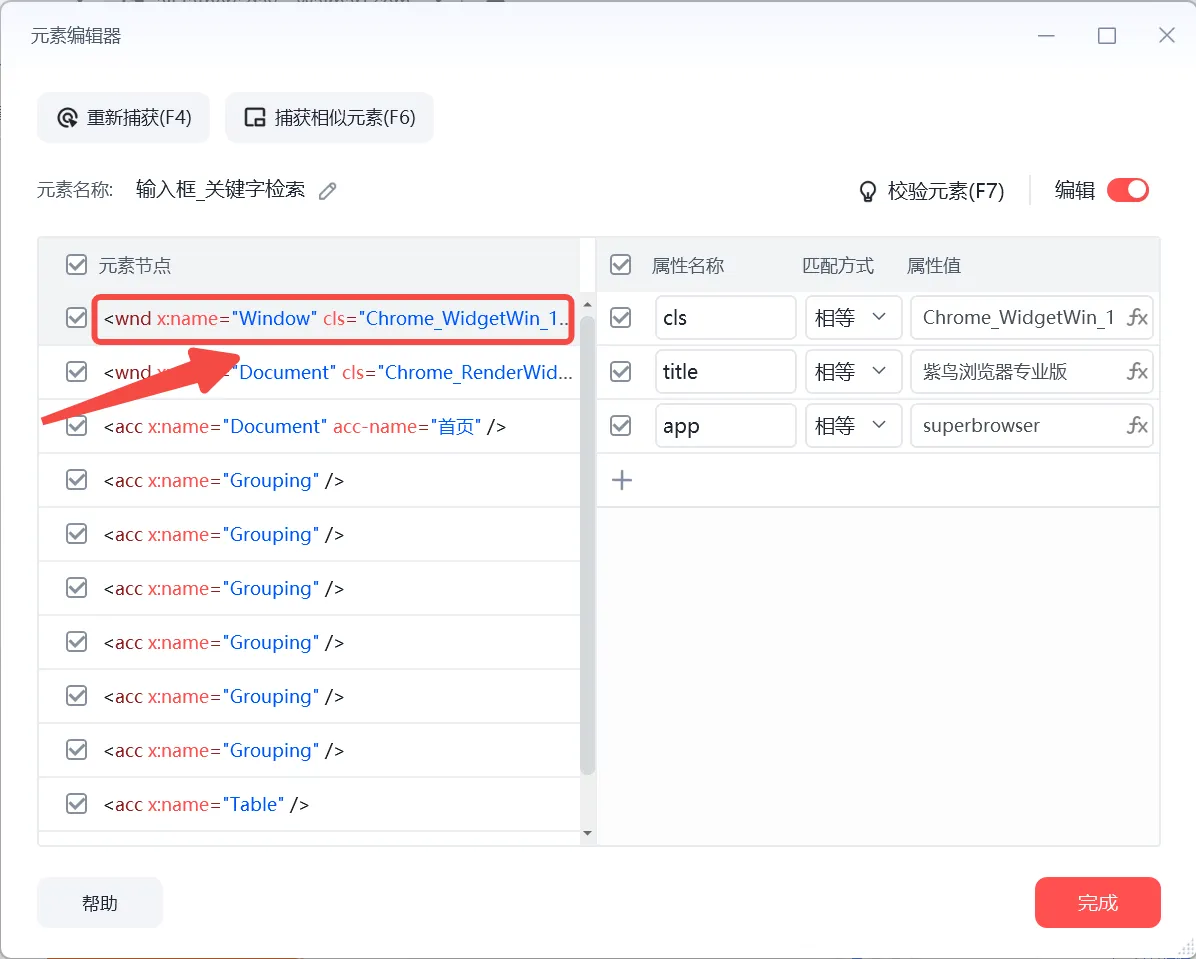 捕获到元素后,除了打开元素编辑页面,查看标签判断,我们还可以根据捕获到的元素图标进行判断;圆圈的是紫鸟浏览器web端,椭圆方框是紫鸟浏览器控制台。