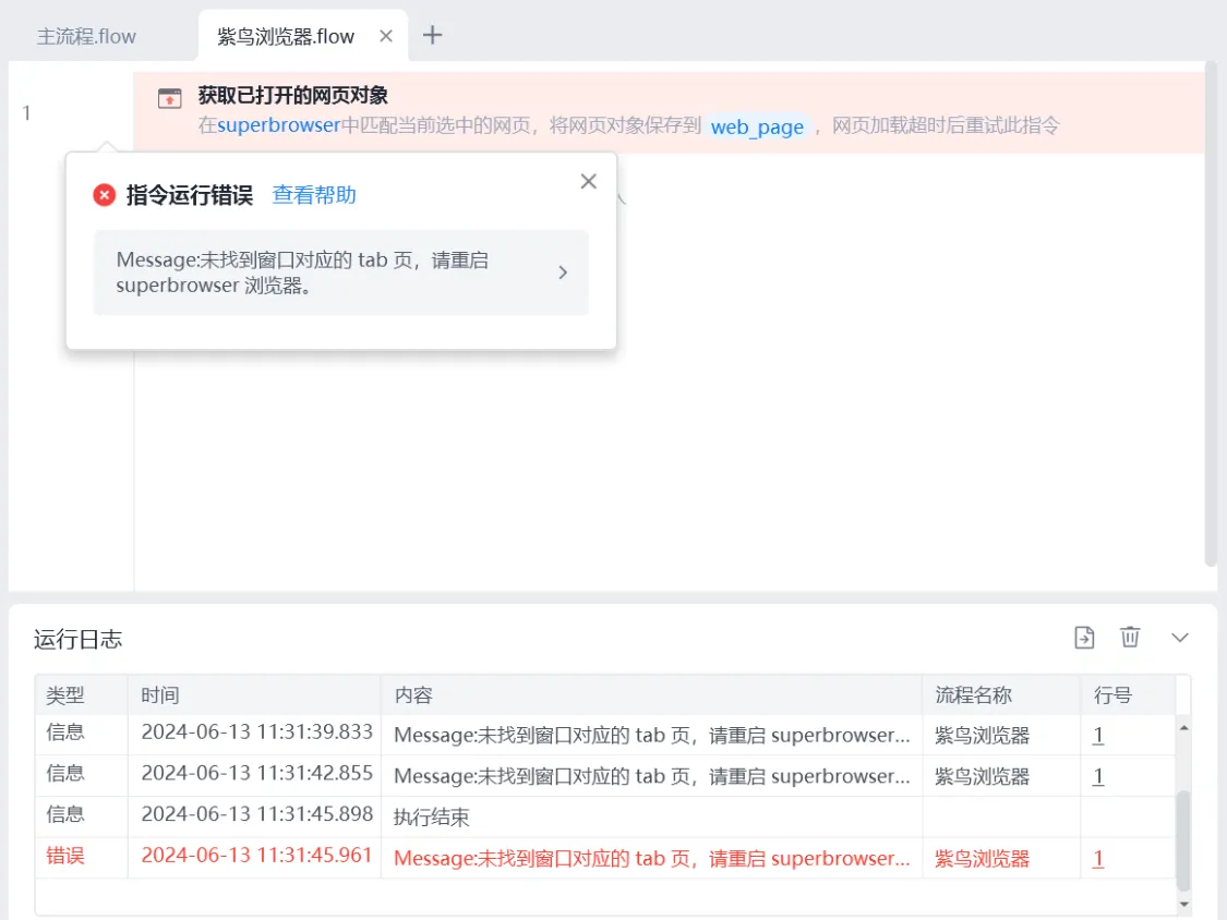 问题描述:紫鸟浏览器【获取已打开的网页对象】报错:Message:未找到窗口对应的 tab 页,请重启 superbrowser 浏览器。