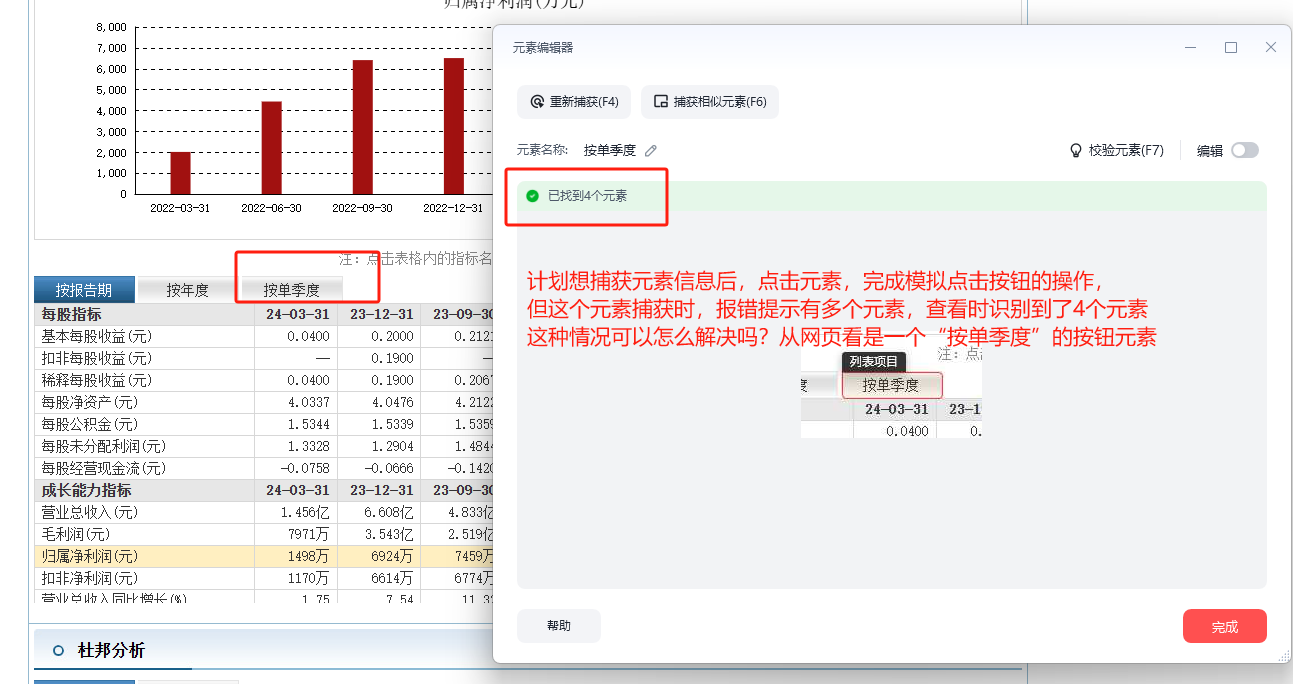 校验元素发现识别到了4个,但同类的“按年度”捕获时可以正常捕获到1个目标元素,想让“按单季度”的按钮也只捕获目标的单个元素,这种情况可以怎么解决吗?