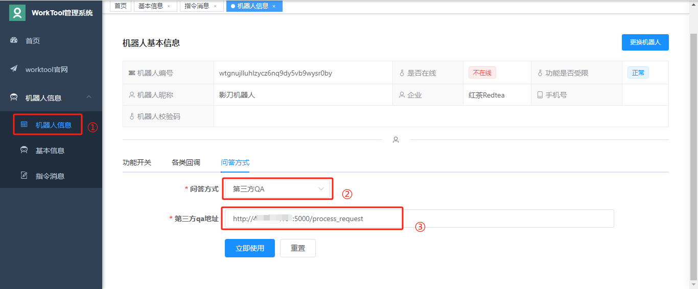 ①在WorkTool控制台中,找到机器人信息,选择问答方式为‘第三方QA’,配置回调地址;