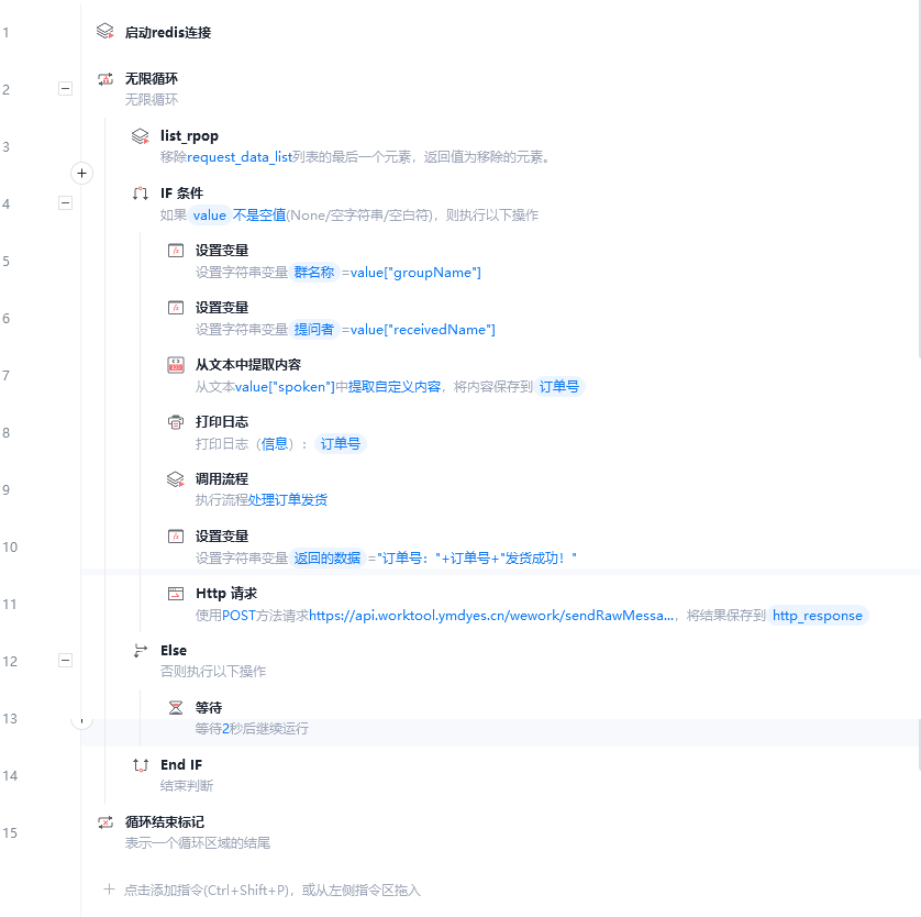 ③接下来就可以使用影刀操作Redis获取消息,将消息进行处理后,通过Http请求(参考worktool发送消息API)发送到企微群。下面是一个测试流程