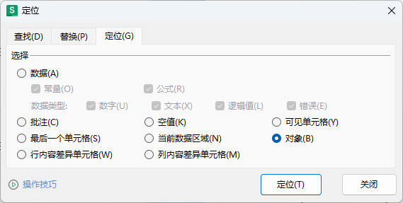 在WPS界面按下键盘上的Ctrl+G快捷键唤起定位窗口,然后分别按下快捷键B选中对象和快捷T来定位选中所有的元素。