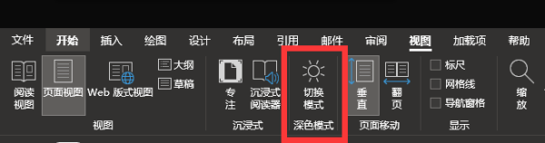 二、当你选择了黑色的office主题后,在选项卡上面会出现深色模式的按钮