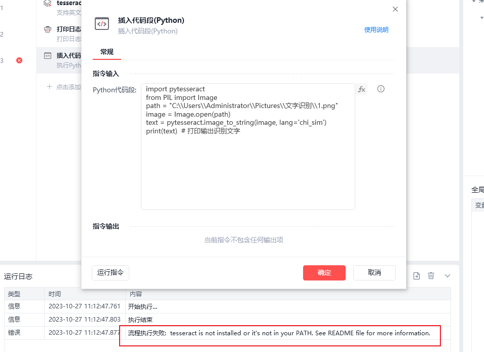 tesseract OCR文字的文字识别不支持中文,我改用插入python代码块的方式,tesseract OCR库本地电脑已经安装好了,本地环境变量也设置好了,用pycharm运行这段代码也能识别出文字来,但是在RPA软件中却不行。请问我要怎么做