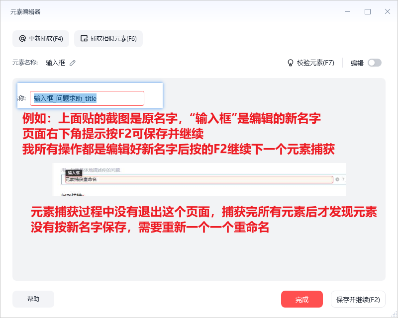 不知道是否操作不当,想预先捕获流程中的元素,在捕获元素页面重命名后按f2继续捕获,捕获完所有元素后才发现并没有按编辑的新名字保存,