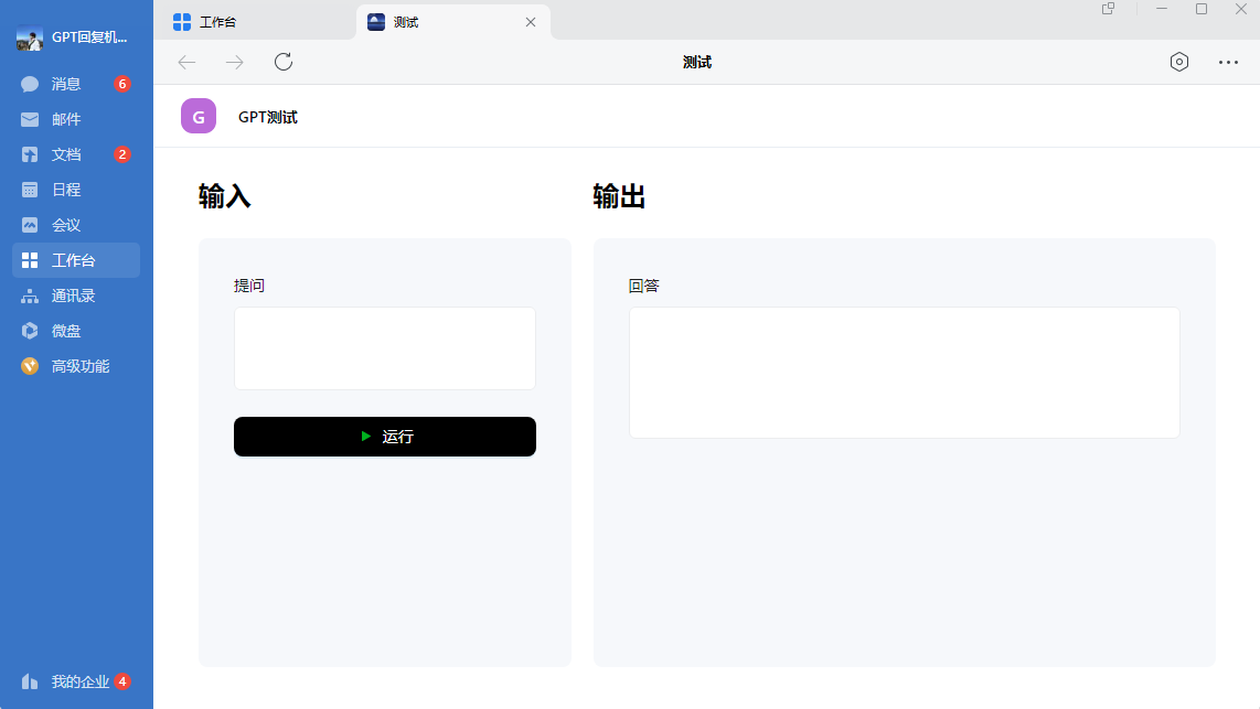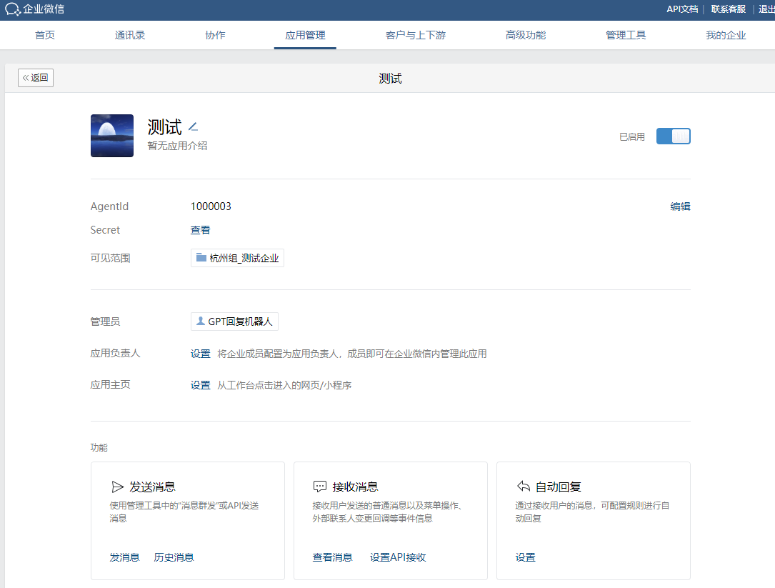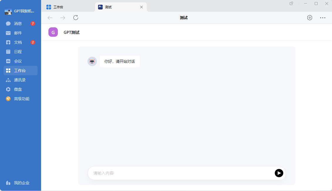 1.其实完成以上配置我们就可以在企微中使用GPT了,下面我来介绍下最简单的使用方法: