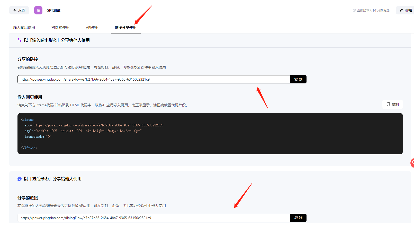 3.以上介绍的方法是最经济,最简单的,可能你觉得上面的应用太简陋了,前面提问的内容没法呈现出来,ok,我们还有对话版,复制对话式使用的链接,重复以上的步骤,即可在企微使用。