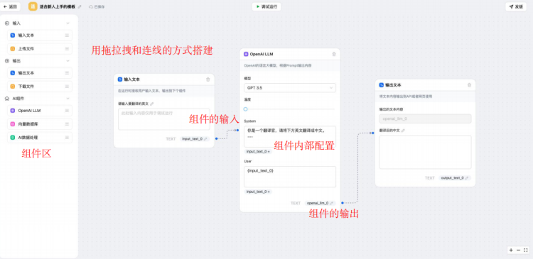 1.影刀AP提供了丰富且持续扩充的AI组件,用户可以通过拖拉拽和连线的方式进行简单直观的搭建。