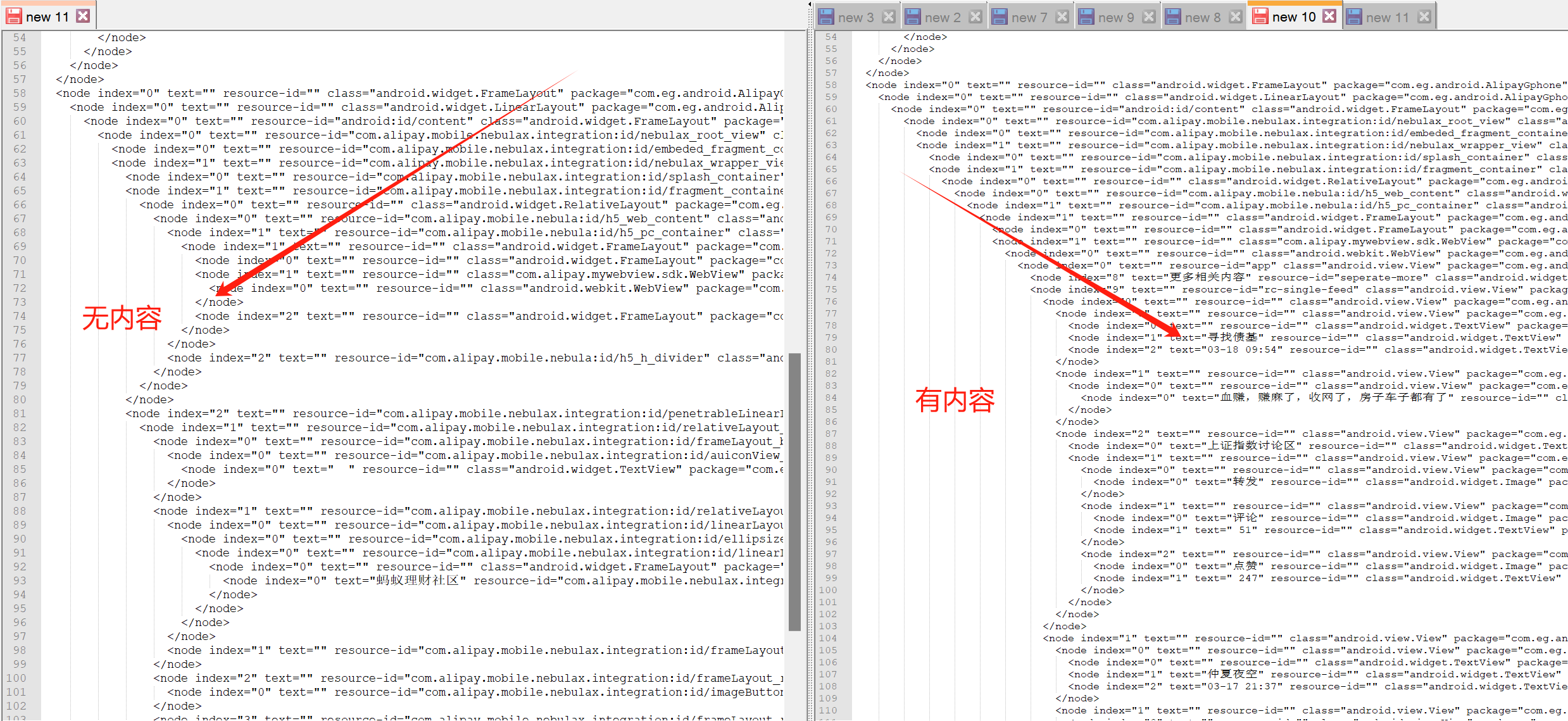 手机滑动翻页获取UI 树,只有第一屏和第二屏能获取到,后面的UI树只有app框架信息,内容信息都没有,这个是什么问题,大佬帮帮忙。