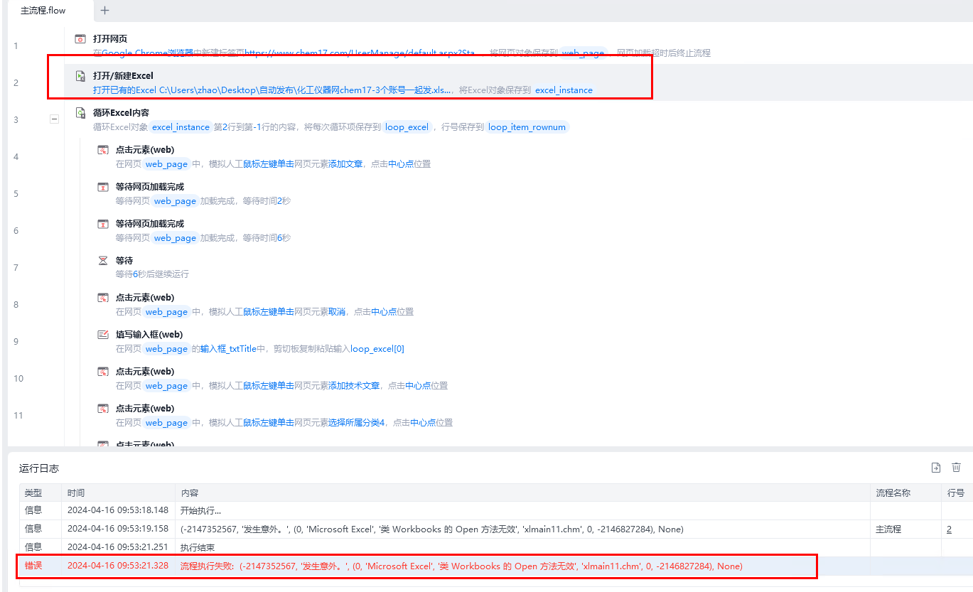 流程执行失败: (-2147352567, '发生意外。', (0, 'Microsoft Excel', '类 Workbooks 的 Open 方法无效', 'xlmain11.chm', 0, -2146827284), None)
