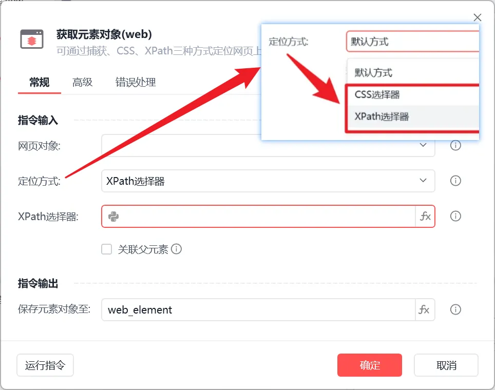 选择定位方式CSS选择器或XPath选择器,在输入框中输入对应的表达式即可: