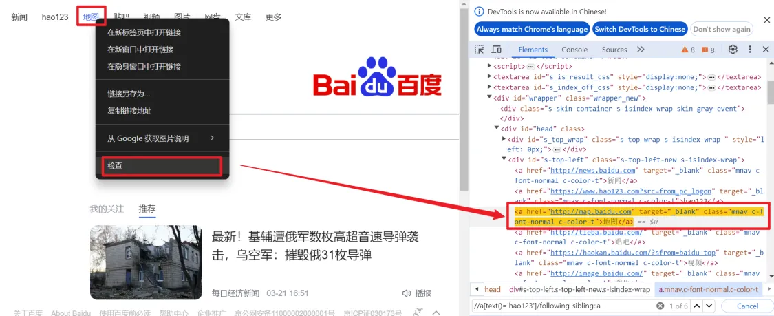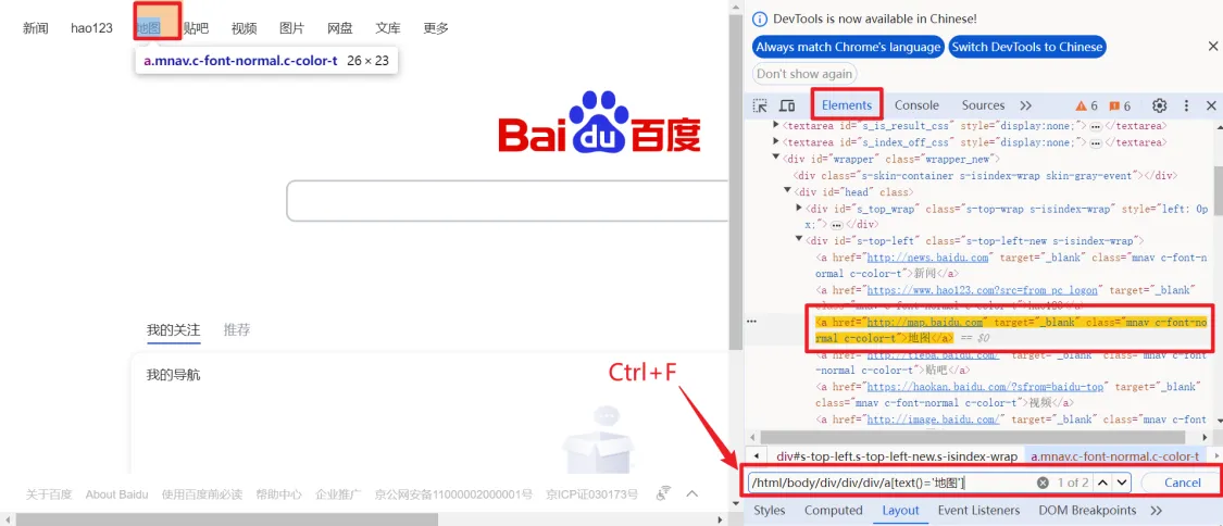 还是以百度首页中定位“地图”元素为例演示如何编写CSS选择器表达式: