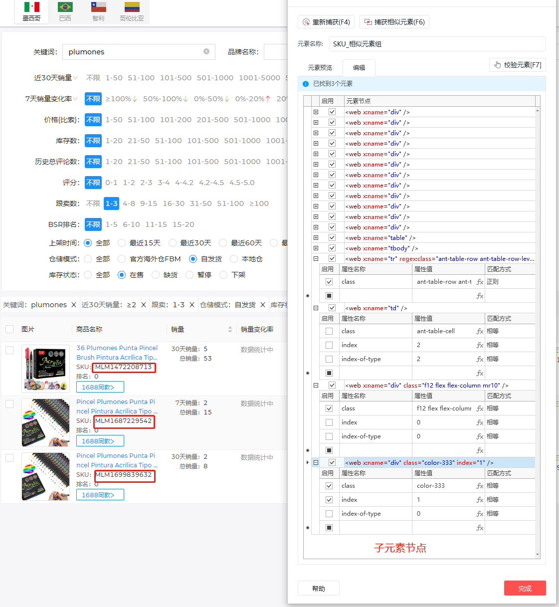 下图中我要抓取SKU编号去EXCEL查询有没有记录,如果有记录就跳过,没有记录就点击对应的采集到商品列表,准备用循环大元素,在里面关联子元素的方法,但是这个子元素和父元素中间还有其他层级,应该如何操作?