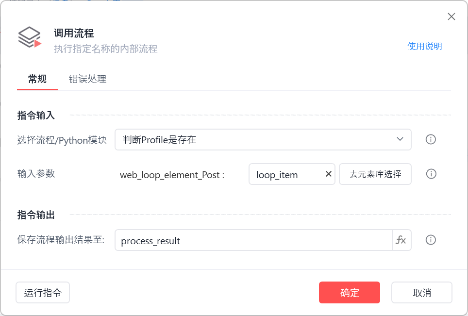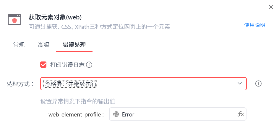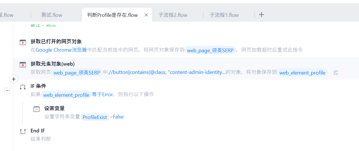 在子流程进行判断,如果元素对象不存在则赋值Error,然后再设置变量,输出变量