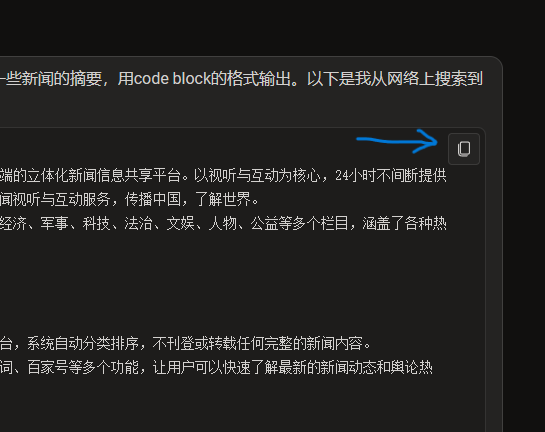 需求1:需要复制网页的多个这样的内容,这是一个code block的格式的窗口,我想每次点击这个蓝色箭头旁边的复制按钮,然后复制到word里,可设置后捕获元素后,下一个则提示找不到元素。