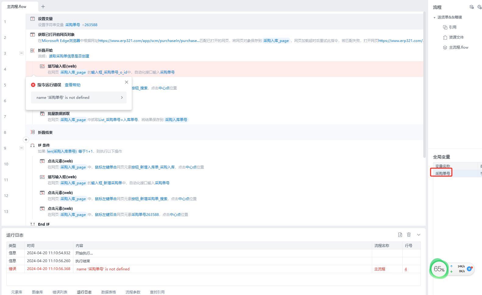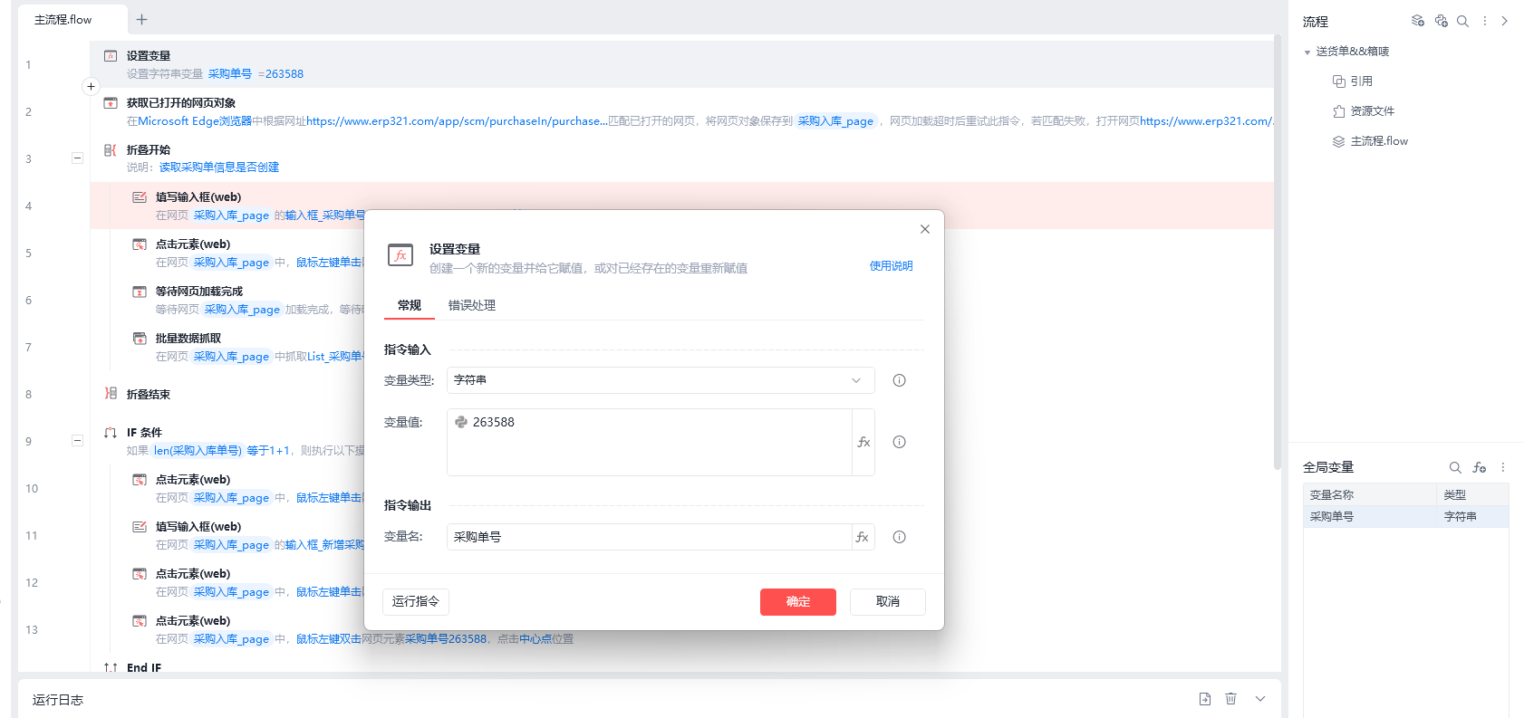 未创建全局变量之前可以正常运行的,因为后续元素里面有用到innertext = 采购单号,随后我添加了全局变量之后就无法正常运行了。