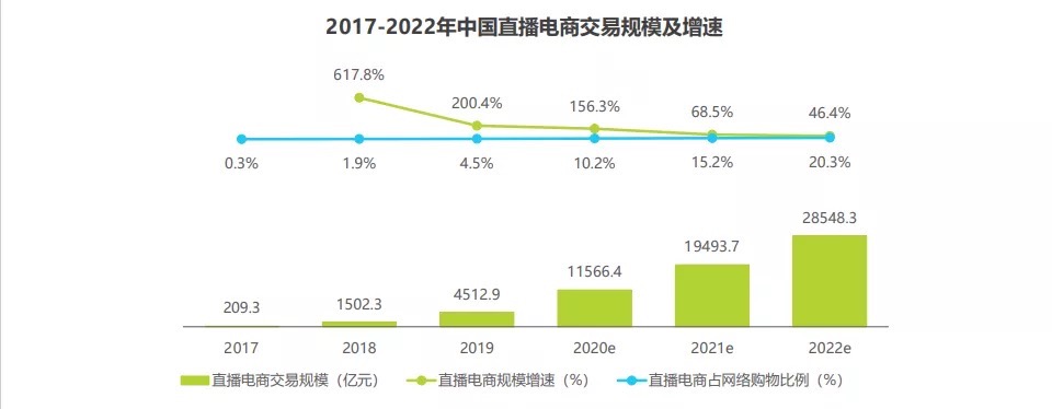 我们先看一组数据:预测到2021年底,直播电商的交易额有望突破2.5万亿元,约占互联网电商总量的20%。全国将涌现200万到300万个直播间,新增就业约2000万个。