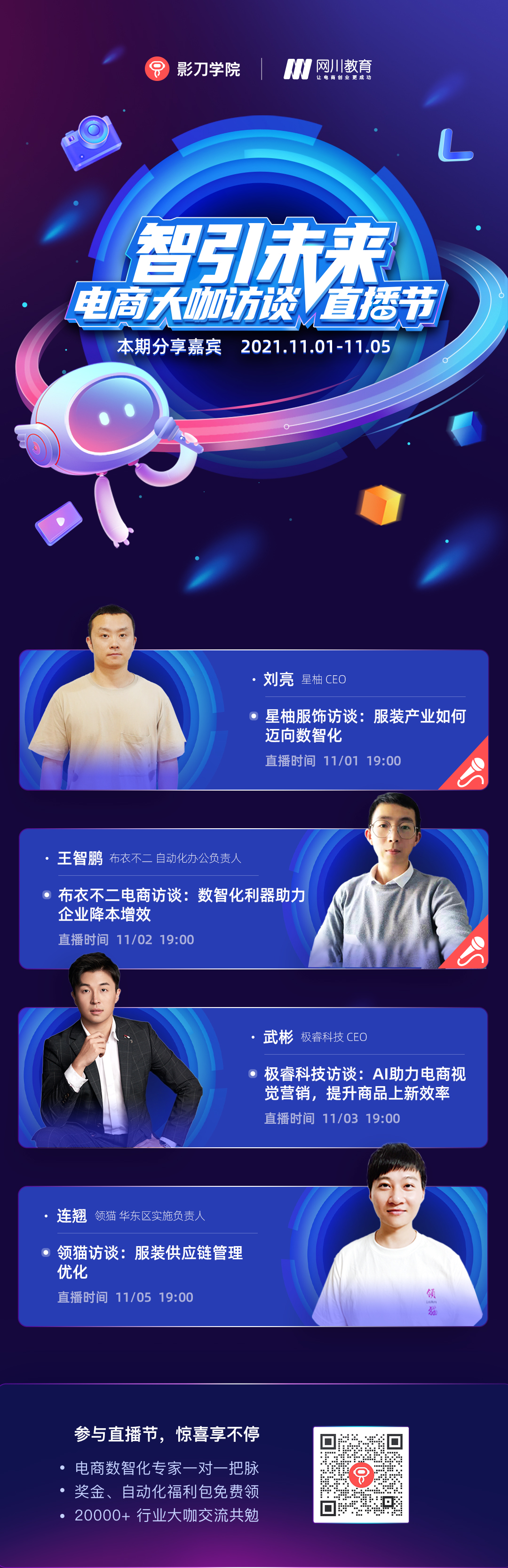 本次直播节将一直持续到11月15日,每天都为大家准备了重量级大咖们的干货分享。网川、抖音电商、观远数据、vika维格、百应、顾家家居、星柚、云犀、极睿科技、领猫、齐讯科技、小布电商、奥康等头部企业的重量级嘉宾都将陆续做客影刀直播间。