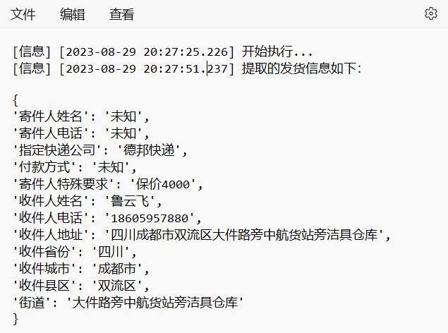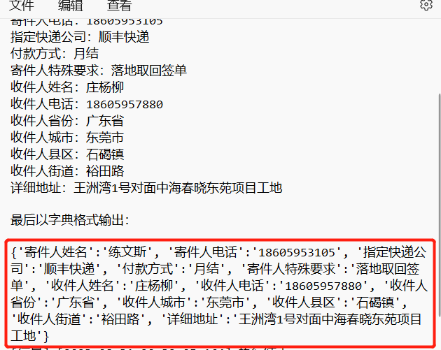 2.输出的结果虽然是字典格式,但是字段不固定,比如收货人的电话号码,有的时候输出"收货人联系方式"又有时候输出"收货人电话"