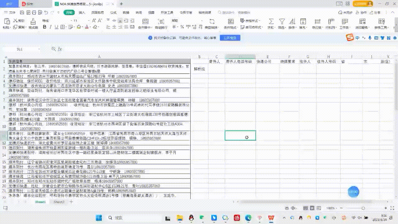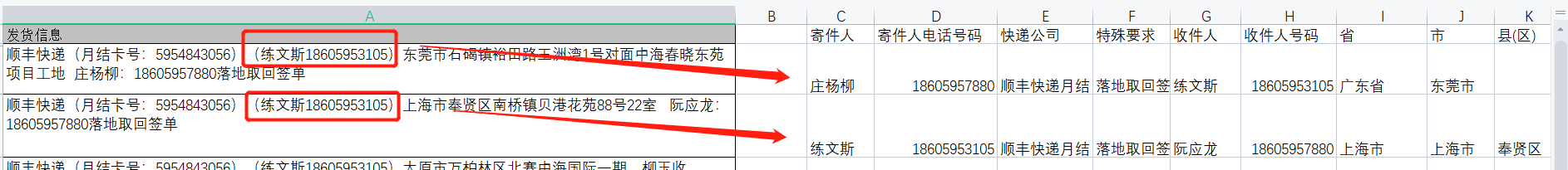 某个客户物流部门,每天需要安排人员花两三个小时处理基本数据。客户收到的下单数据不规范,需要导入SAP的字段又比较多,涉及的字段包括寄件人姓名(如果有)、寄件人联系方式(如果有)、指定快递公司、结算方式(如有)、其他特殊需求(加急、打木架、落地卸等)、收件人姓名、收件人联系方式、收件人详细地址(省市县区街道)。