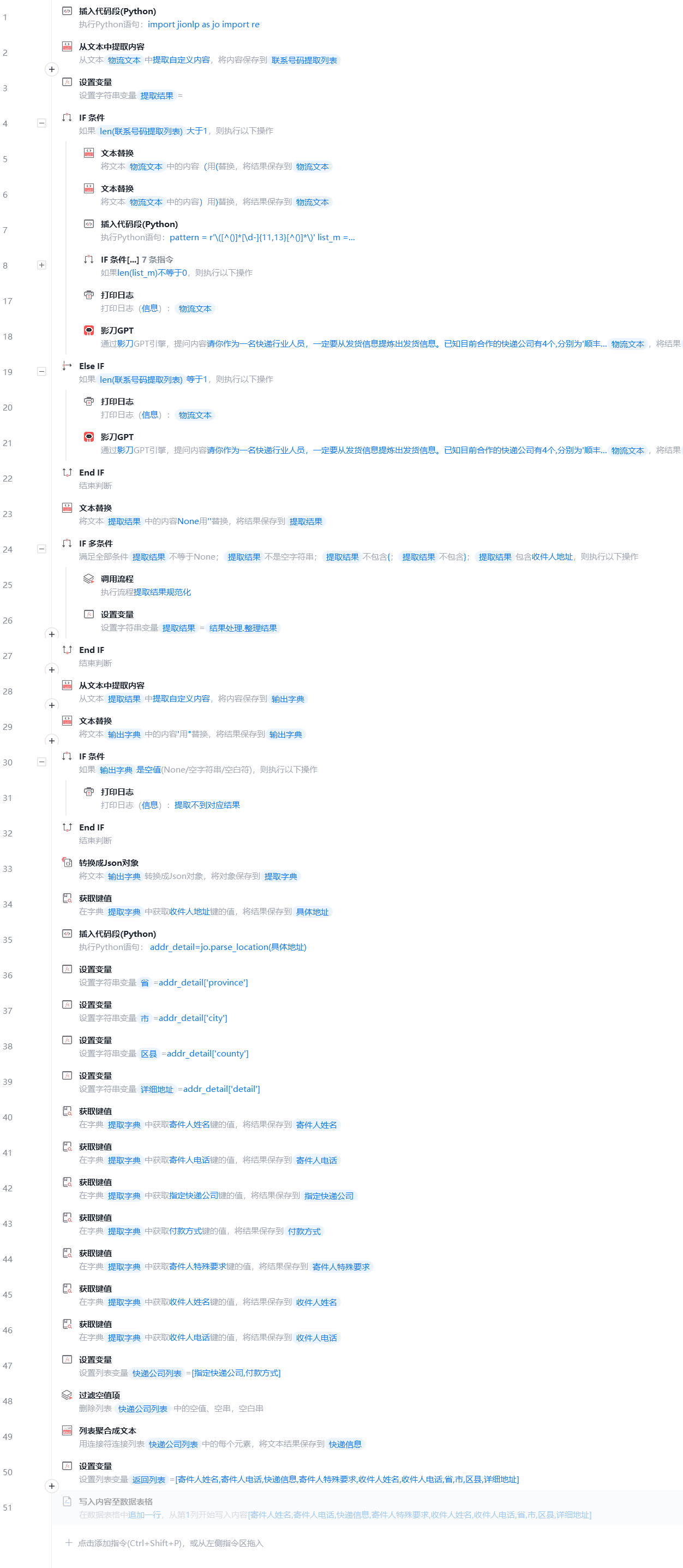 1.由于不同的场景不方便用一个提示词获取信息,那就得做区分。小白这边取巧了,因为正常情况下,不管是下单人还是联系人,都留有电话号码,依照电话号码格式去判断哪一种情况。大家可以网上找一下国内手机/固话的格式,用正则匹配提取号码个数,然后采用不同的提示词,即仅有收货人的话,就不提示获取寄件人。