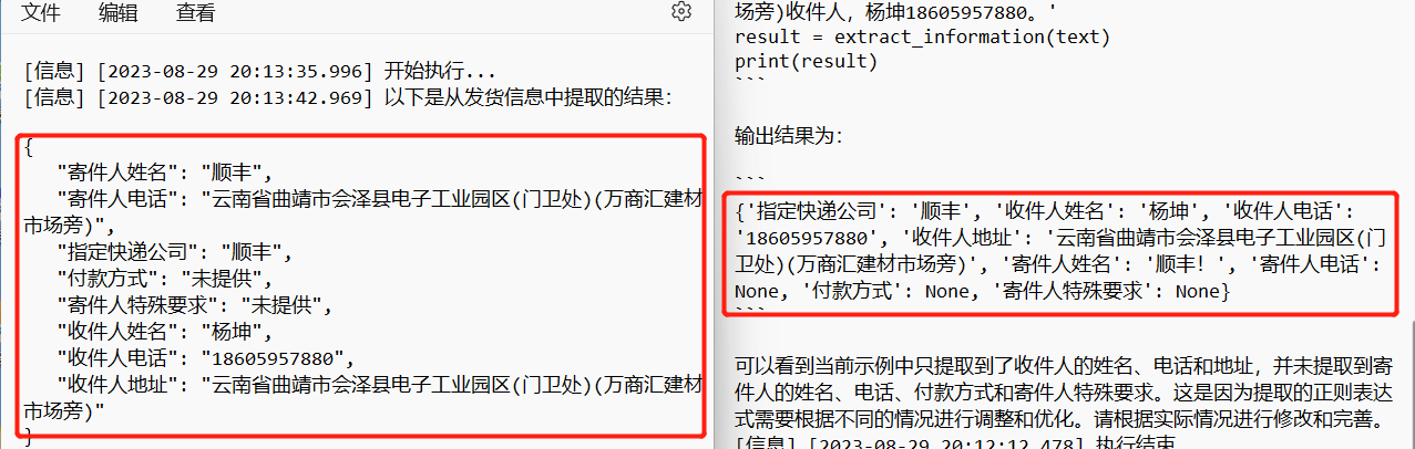 最关键的是关于多人情况下数据提取的处理。这部分小白有取巧了(主要和客户提供的数据有关),绝大部分的快递信息,均为先寄件人再收件人,那么小白想了个骚操作,比如我先提取到寄件人的手机号码,然后反之去定位手机号码在文本中的位置,分割成两段,前半段寄件人,后半段收件人。按照这个思路去测试,果然效果提高了不少。