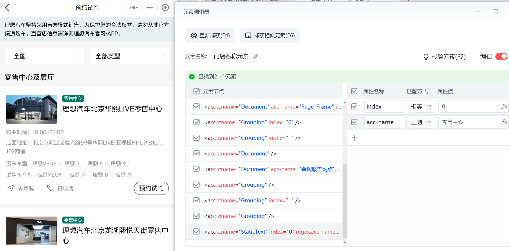 捕获到的相似元素 增加了acc-name正则规则 必须包含“零售中心”四个字 但是最上面的“零售中心及展厅”也被规则允许了,现在想到了2个方案
