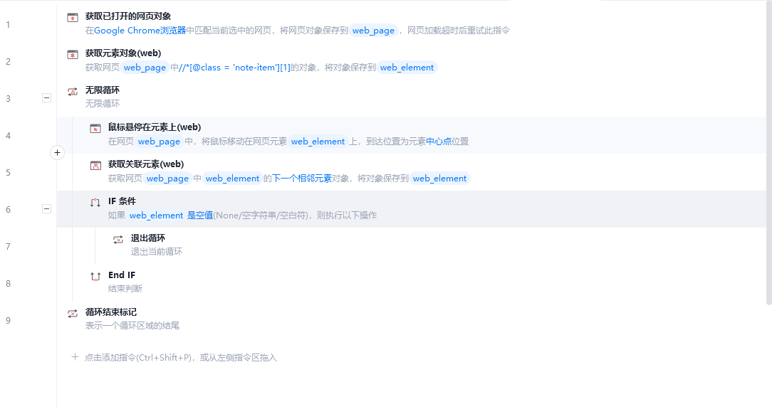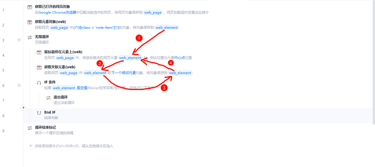 此方案是先获取网页懒加载元素列表的第一个元素,通过第一个元素关联它的下一个相邻元素,使用无限循环一直循环当前元素的下一个相邻元素,用悬浮元素指令来代替滚动的操作让它自动加载出下一个元素。当循环到最后一个元素时它的下一个相邻元素会变成空值,再用空值当作判断退出循环的条件,以此来达到循环相似元素的效果。