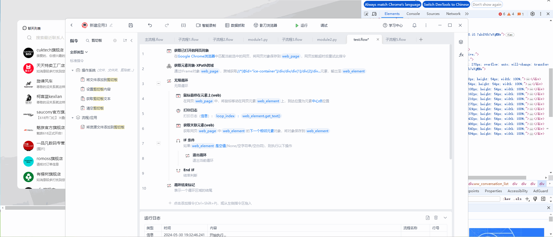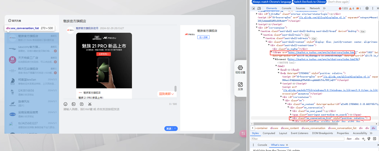 淘宝消息页是一个比较经典的同时具有懒加载和跨域场景的网页(见下图,buff叠满),捕获相似元素只能校验到当前页面渲染出的元素,滚动网页后右侧的源码部分也不会新增层级,算是断了通过xpath获取相似元素的方法,使用懒加载指令会出现死循环的情况😣。