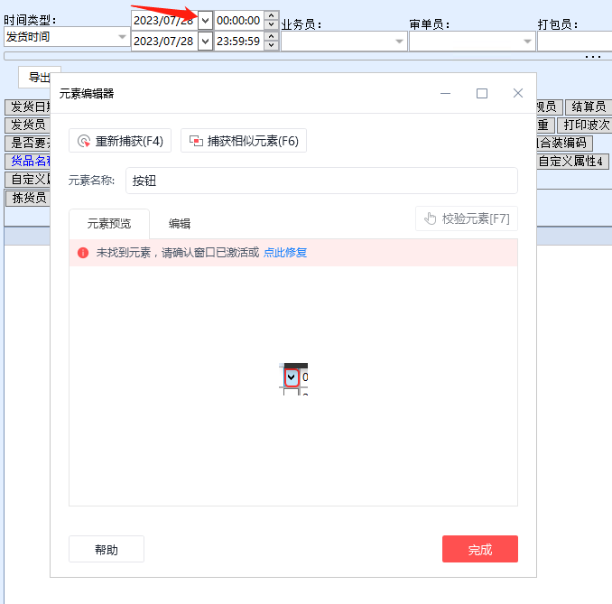 旺店通 运行时找不到日期旁的小按钮,校验说未找到元素,请确认窗口已激活