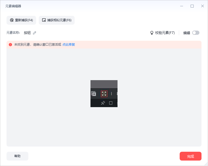 遇到的问题:好像软件窗口捕获到了,但是里面的所有元素,都捕获不了,包括全屏按钮这个元素,不知道问题在哪里?