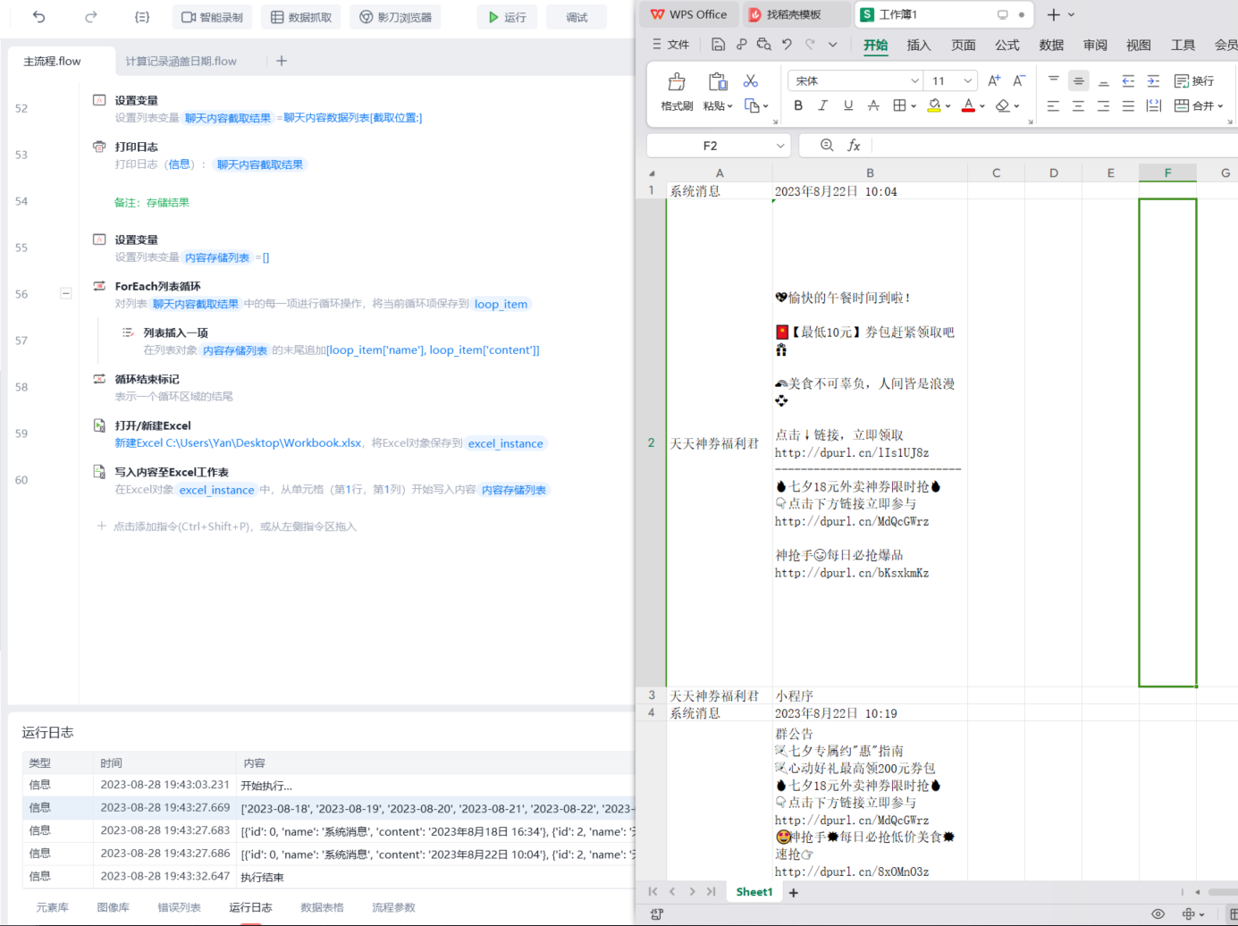 - 执行方式:通过在微信群聊天框模拟鼠标滚轮不断上滑来不断加载数据,再用【获取个人微信聊天内容】抓取到记录内容;